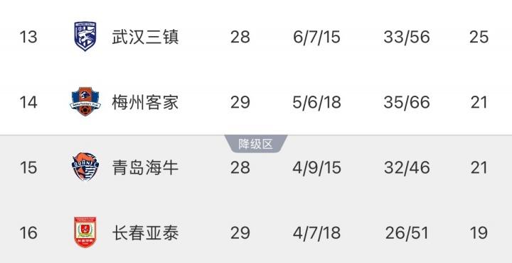 目前,梅州客家和长春亚泰都踢完29轮,分别积21分和19分,在还剩1轮情况下,积分榜已经不可能超越26分的深圳新鹏城和25分的武汉三镇。如此一来,新鹏城和三镇都在本轮过后确认保级成功。